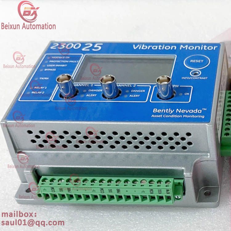 Based on Bently Nevada specifications, the 2300-25 Vibration Monitor is a dual-channel, standalone device for continuous machinery condition monitoring and protection. It accepts signals from two velocity transducers, processing each channel's overall vibration magnitude independently. Each channel provides a 4-20 mA output proportional to vibration level and features configurable Alert and Danger alarm setpoints with dedicated relay outputs for protective shutdowns. Designed for DIN-rail mounting, this robust monitor offers a cost-effective solution for basic vibration monitoring and critical machine protection on dual points without a full rack system.